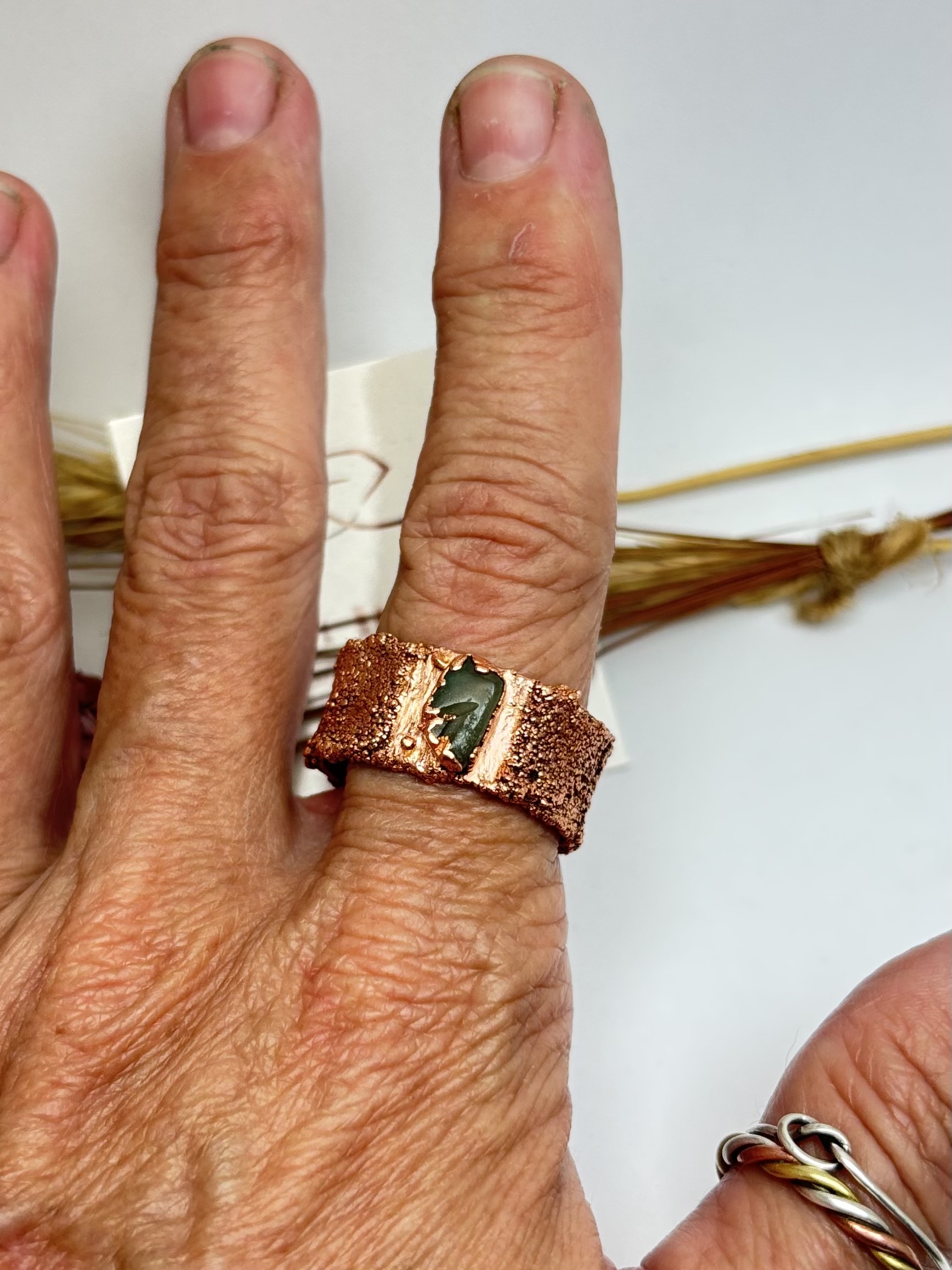 Anel Bruto em cobre puro com quartzo verde natural. Peça de presença marcante, com textura rústica e acabamento orgânico, moldada manualmente. A superfície irregular valoriza o contraste entre o metal e a pedra, criando um visual forte e autêntico.