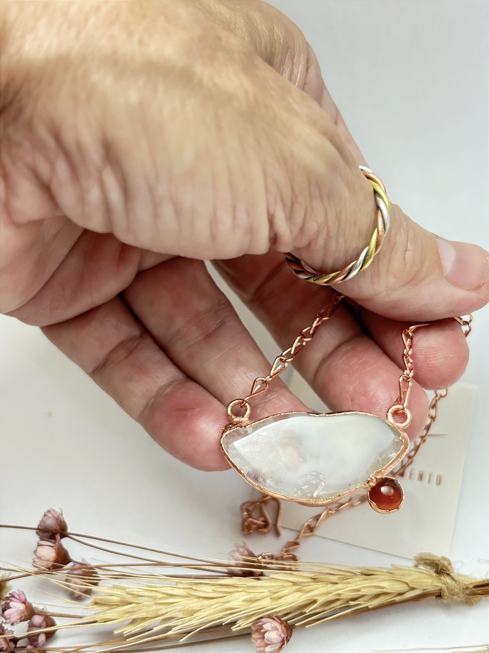 A peça, em estilo gargantilha, combina a leve transparência e os desenhos únicos da ágata com o ponto de cor quente da cornalina, criando um contraste delicado e equilibrado. O metal é moldado à mão, valorizando as formas orgânicas e o caráter artesanal da joia.